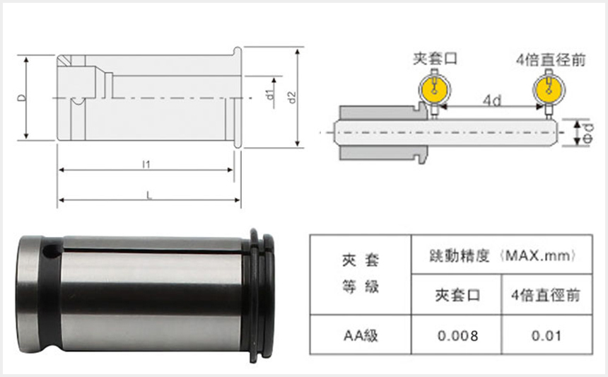 C20強(qiáng)力筒夾按照精度分,可分為A級(jí),AA級(jí),AAA級(jí)。A級(jí)的精度為: 0.015mm以內(nèi),
